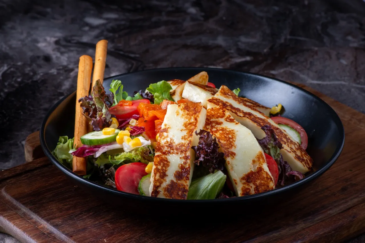 Balsamik sosla harmanlanmış Akdeniz yeşillikleri, cherry domatesler, salatalıklar, közlenmiş biberler, mini mısırlar ve ızgara hellim peyniri.