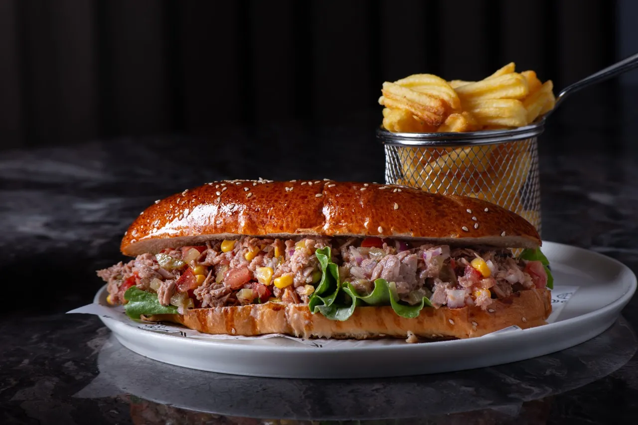 Ton balığı, mısır, domates, turşu, patates kızartması, tatlı acı sos.